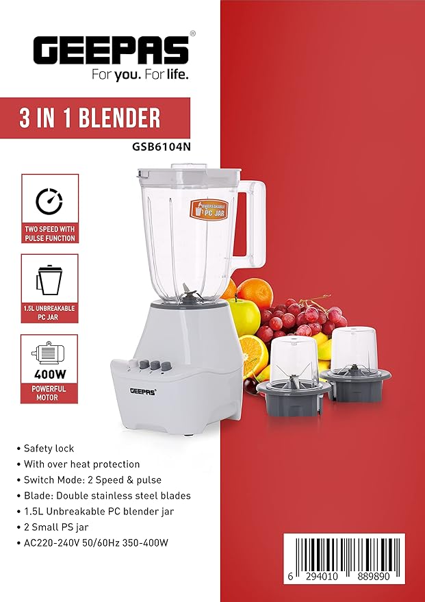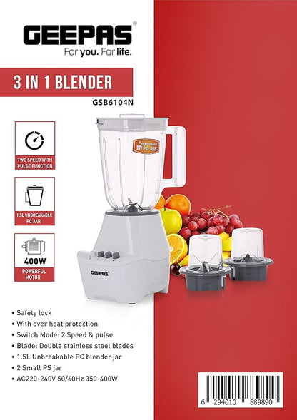 Geepas 3-in-1 Blender GSB6104N: Powerful 400W with Unbreakable Jars and Stainless Steel Blade